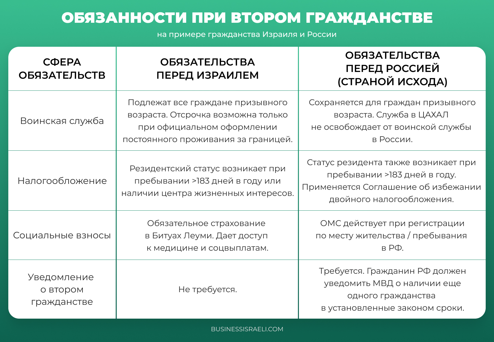 Гражданство Израиля дает право на социальные гарантии, но также накладывает обязательства – их исполнение не зависит от отсутствия или наличия гражданства другой страны, кроме Израиля.