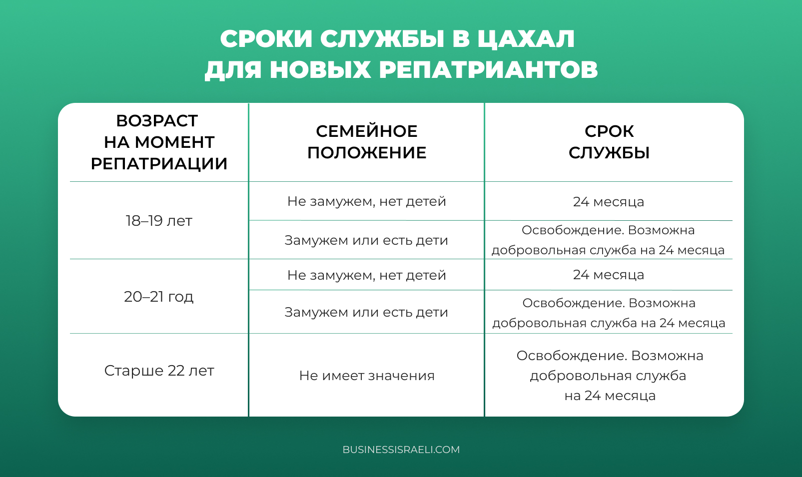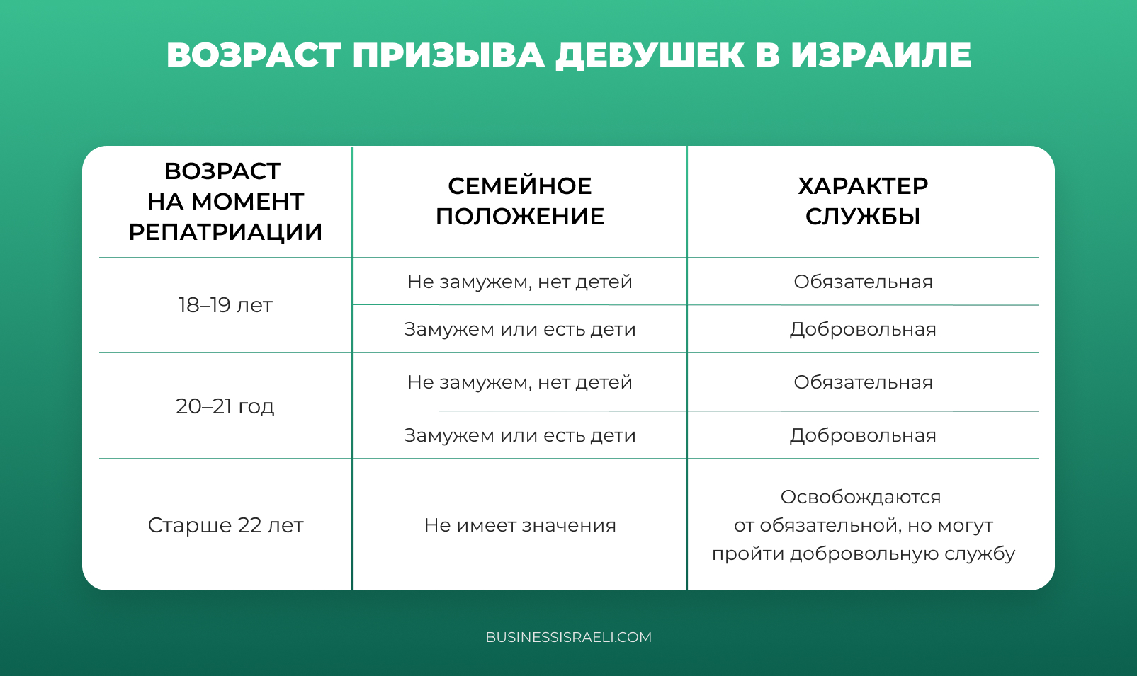 Для девушек действуют дополнительные условия. Те, кто репатриировался в возрасте от 22 лет, подлежат освобождению, но могут пройти службу добровольно.