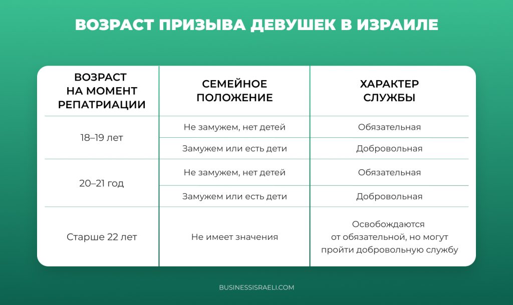 Для девушек действуют особые правила, которые учитывают их возраст на момент переезда в Израиль и семейное положение. Дата репатриации определяет, будет служба обязательной или добровольной.