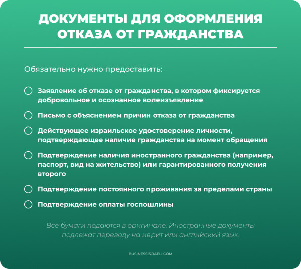 - Проверка соответствия условиям: совершеннолетие, отсутствие риска остаться без гражданства вообще, урегулированный воинский статус, проживание за пределами Израиля;