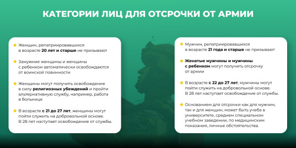 Некоторые граждане освобождаются от призыва в силу их деятельности, статуса или особых обстоятельств. Ниже — таблица по отсрочке для специальных категорий: