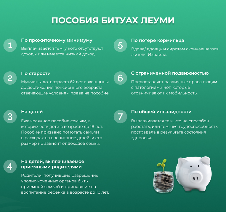 Эти виды помощи являются основой социальной защиты в Израиле. Размер и условия выплат от Битуах Леуми зависят от стажа, уровня заработка, семейного положения и индивидуальных обстоятельств каждого случая.